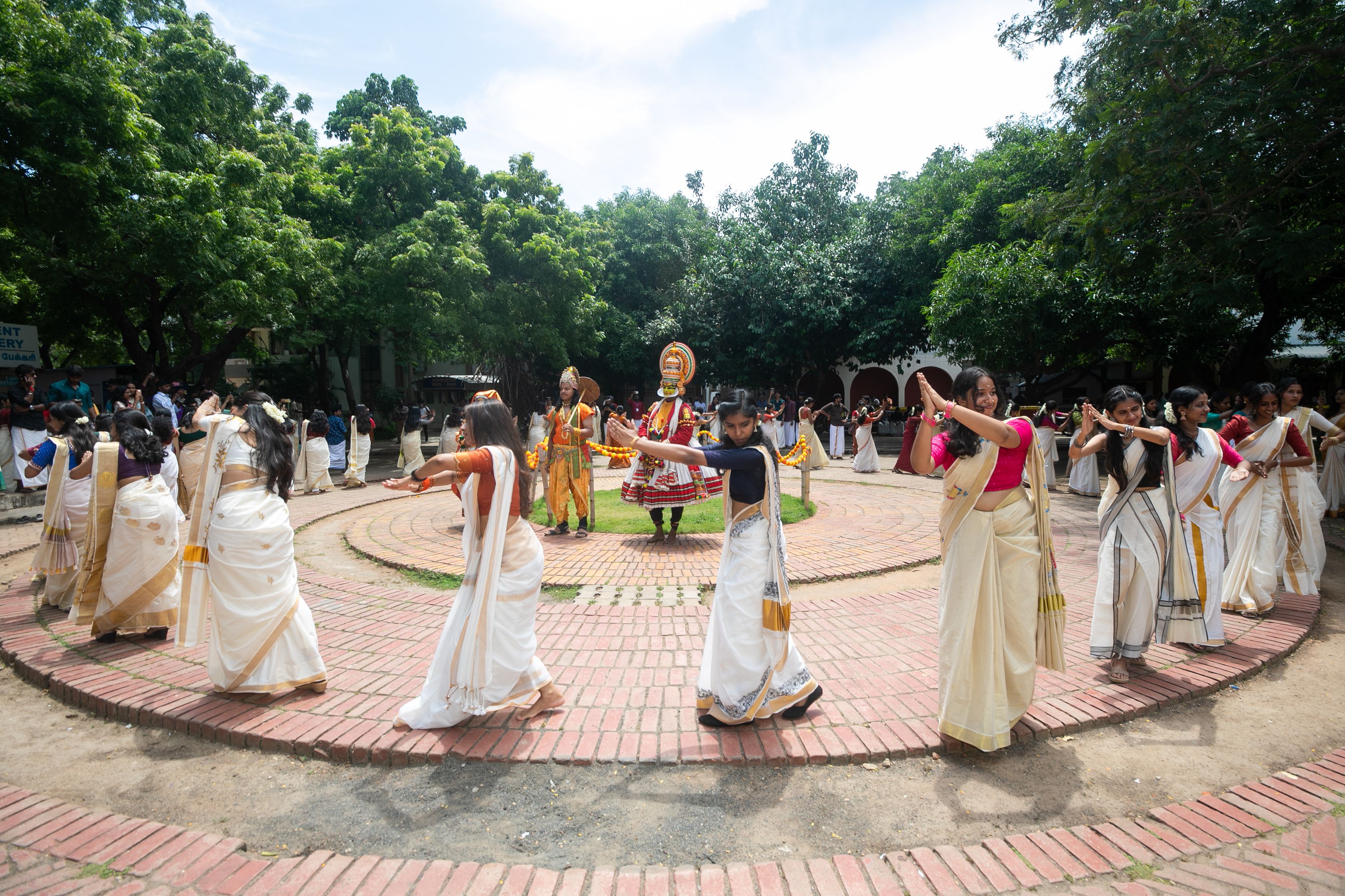the lamp by the Chief Guest and dignitaries. A traditional Thiruvathira performance further enhanced the cultural essence of the event. The Presidential Address was delivered by Dr. S. Ganesan, Vice Chancellor, emphasizing the importance of preserving traditions and unity. A highlight of the program was the welcoming of Mahabali onto the stage along with Singarimelam, which symbolized the arrival of prosperity and happiness. The celebrations then moved into the cultural performances, featuring a mix of classical and modern art forms. The lineup included Kerala Nadanam, Mohiniyattam, Fusion Dances by various student teams, Solo Singing performances, and even a Ramp Walk that showcased traditional attire with creativity. Followed by the Prize distribution of Pookalam competiton. These performances reflected the immense talent and diversity of the student community. The formal session concluded with a heartfelt Vote of Thanks by Eba Sara Baiju, Final Year