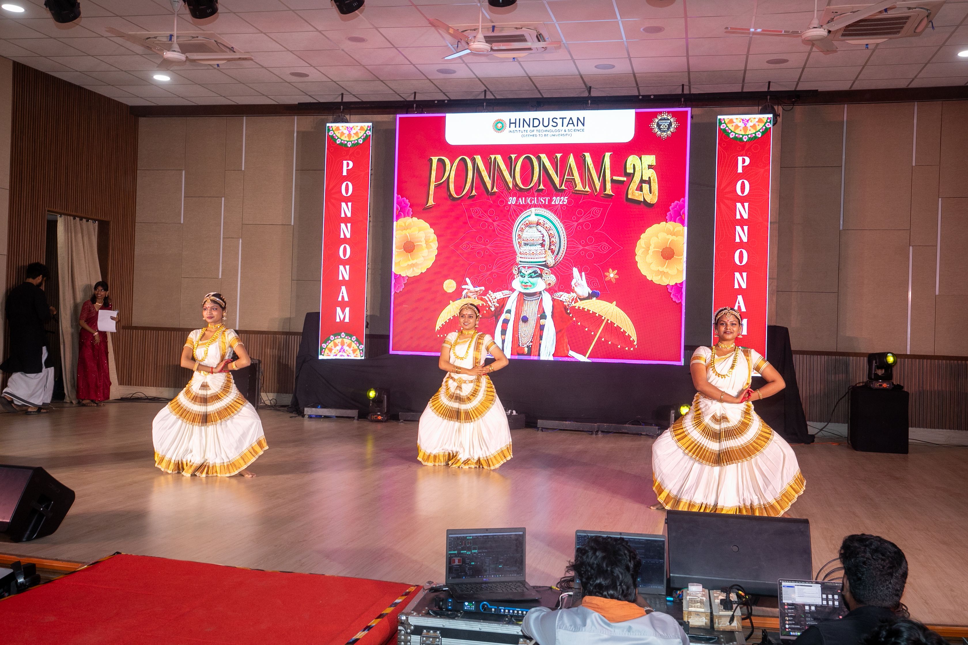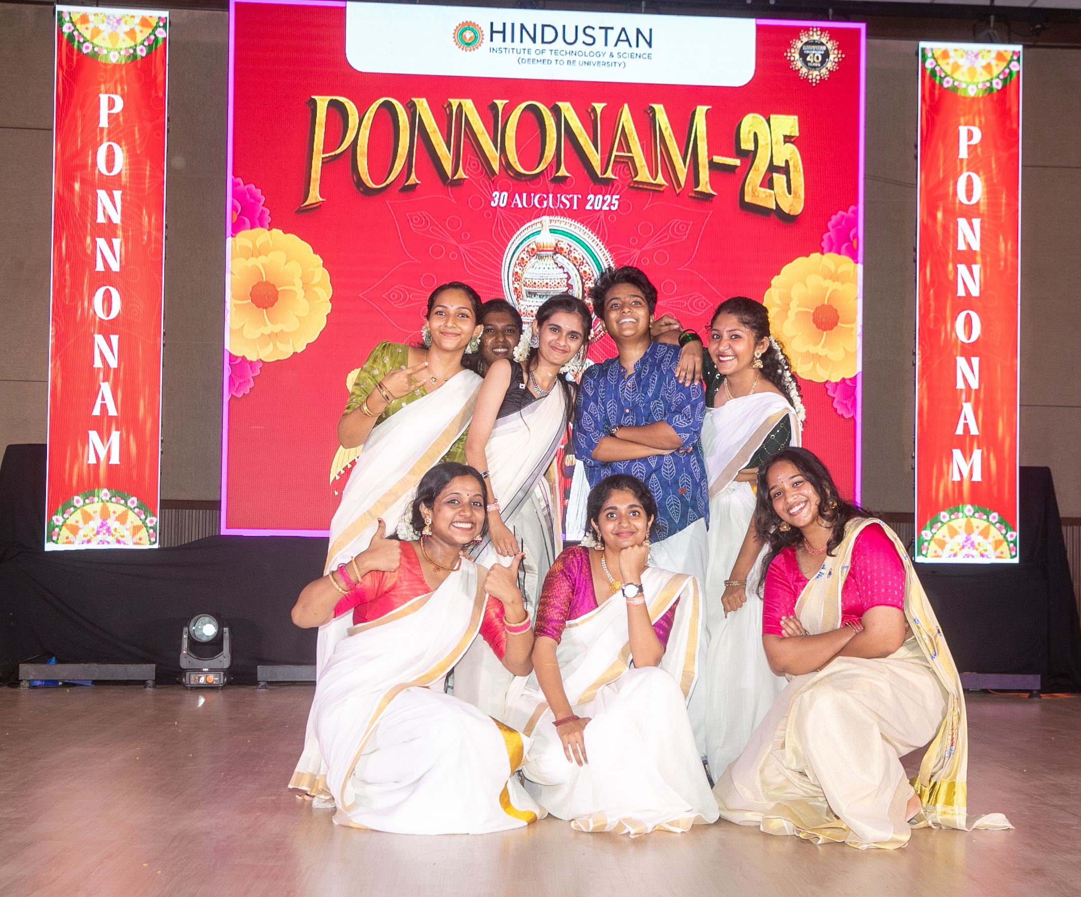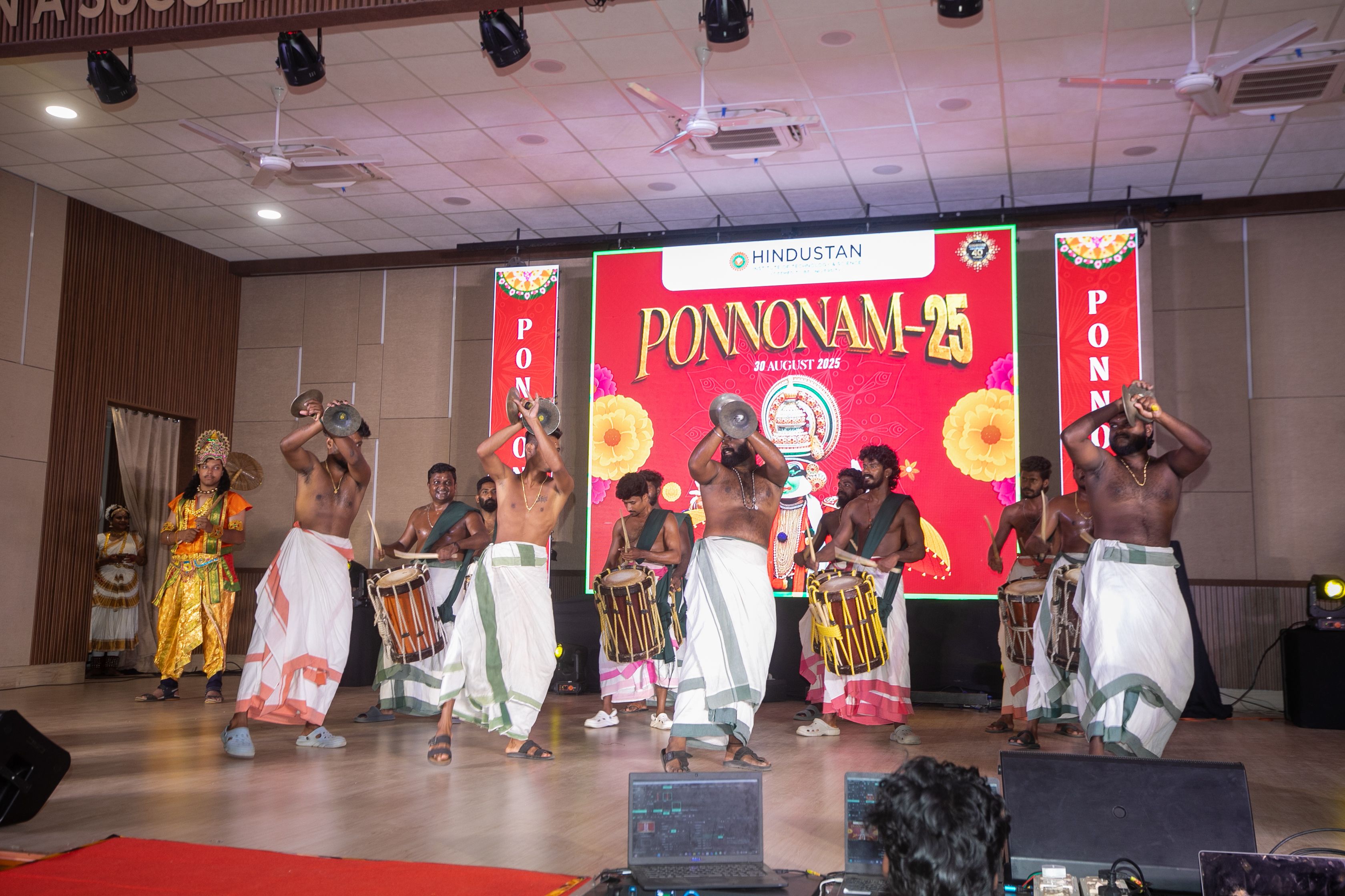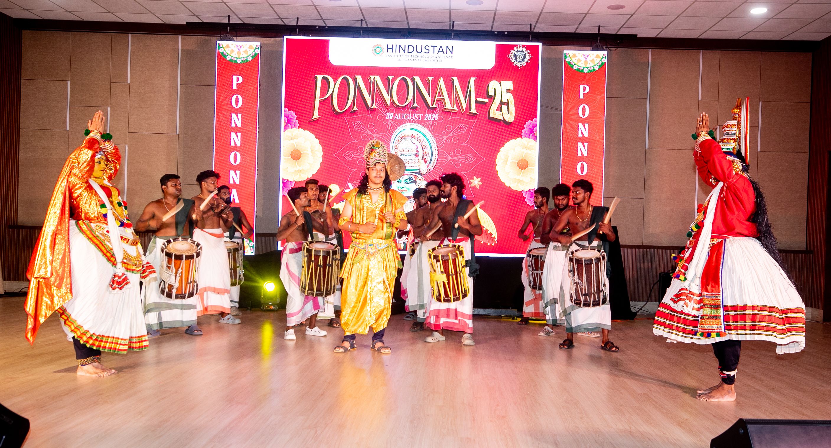 The PONNONAM ’25 Celebrations at Hindustan Institute of Technology and Science was a grand showcase of tradition, culture, and festivity, bringing together students, faculty, and dignitaries under one vibrant platform. Organized on August 30th, 2025, the event highlighted the rich cultural heritage of Kerala through traditional performances, processions, and a festive feast, while also embracing the youthful spirit of creativity and unity within the campus community. The PONNONAM ’25 Celebrations was held on August 30th, 2025, at the MGR Auditorium. The event began at 11:00 am with the registration of participants at the Science Block. This was followed by a vibrant start with the Mega Thiruvathira performance by 20 members, which set a graceful and festive tone. Soon after, a colourful procession featuring Singarimelam, Kathakali, and various traditional art forms spread cheer across the campus, inviting everyone into the spirit of Onam. The audience then gathered at the MGR Auditorium, where the formal ceremony commenced with a prayer led by Rev. Justin Jose. The welcome address was delivered by Anna Vijai, Final Year B.Tech Aeronautical Engineering, followed by the lighting of