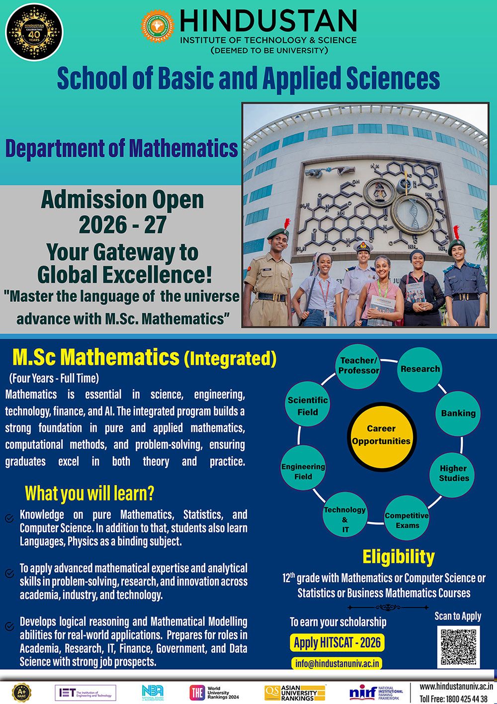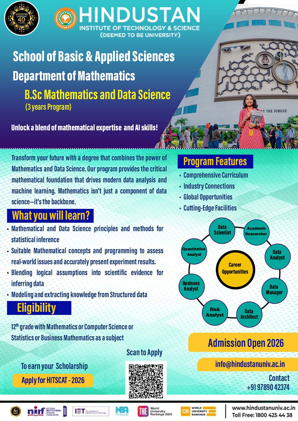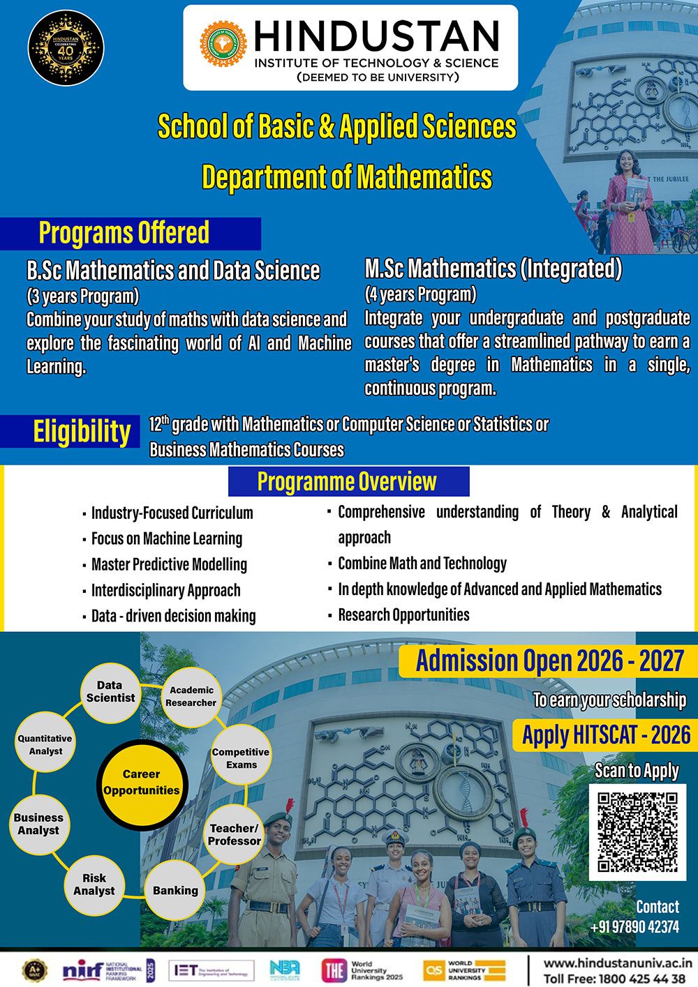 The department offers BSc Mathematics and Data Science, MSc Mathematics (Integrated) and Ph. D program. Faculty members are dedicated educators and active researchers, often engaged in interdisciplinary projects and contributing to advancements in pure and applied mathematics. Students are encouraged to participate in research, internships, and mathematics competitions to enhance their learning experience.